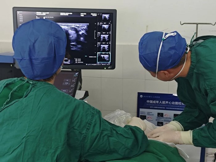 近日,北京地坛医院徐州医院(市七院)超声医学科成功开展了医院首例超声引导下甲状腺结节细针穿刺活检术(FNA),病理科于当天下午便出具了病理诊断结果。此项新技术的开展,填补了我院在该技术领域的空白,为周边甲状腺疾病患者就医提供了便捷,为未来我院甲状腺相关疾病诊疗的开展奠定了基础。
