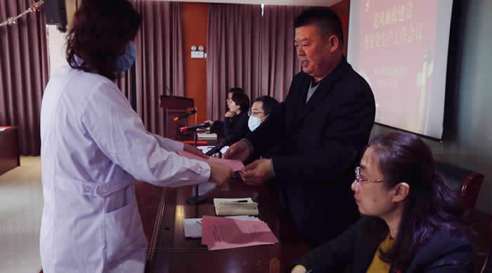 副院长姚均伟对医院安全生产工作方面进行发言。姚院长首先传达通报了上级部门关于安全生产文件及有关安全生产事故情况案例,进一步强调医院安全生产工作的重要性。其次,对医院下一步安全生产工作进行了部署并提出三点工作要求:一是全院各科室高度重视安全生产工作,定期排查解决医院安全生产中存在的问题;二是要严格按照"一岗双责,失职追责"的要求,发现问题,及时整改。三是各科室主任作为科室安全生产的第一责任人,要抓好科室的安全生产工作,做到心中有数,严防安全生产事故的发生。最后,与各科室负责人签署递交了《医院安全生产(消防)目标管理任务书》。